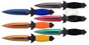 Les couteaux sont noirs, avec un revêtement coloré sur les biseaux de la lame : jaune, orange, bleu, vert, rouge et noir.